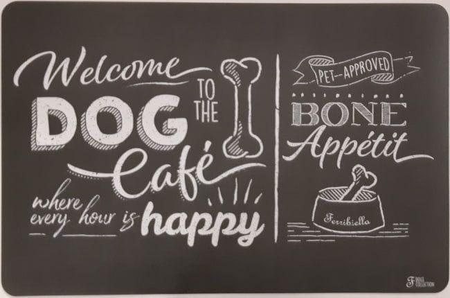 The absorbent Pet Food Mat Bone Appetit keeps your pet's food off the floor.