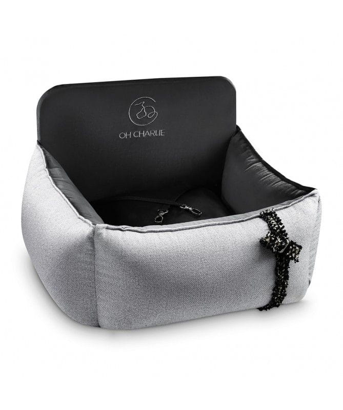 Car seat is designed in elegant style. Black connect with grey materials. Inside we designed it from very practical material that has smaller absorption of water and dust than traditional material. In each side and in the back there are zips so that you could easily remove all pillows from inside and was hit – we understand that some animals has motion sikness and you will need to was hit often.