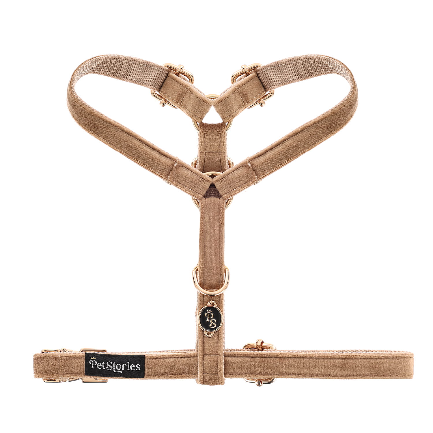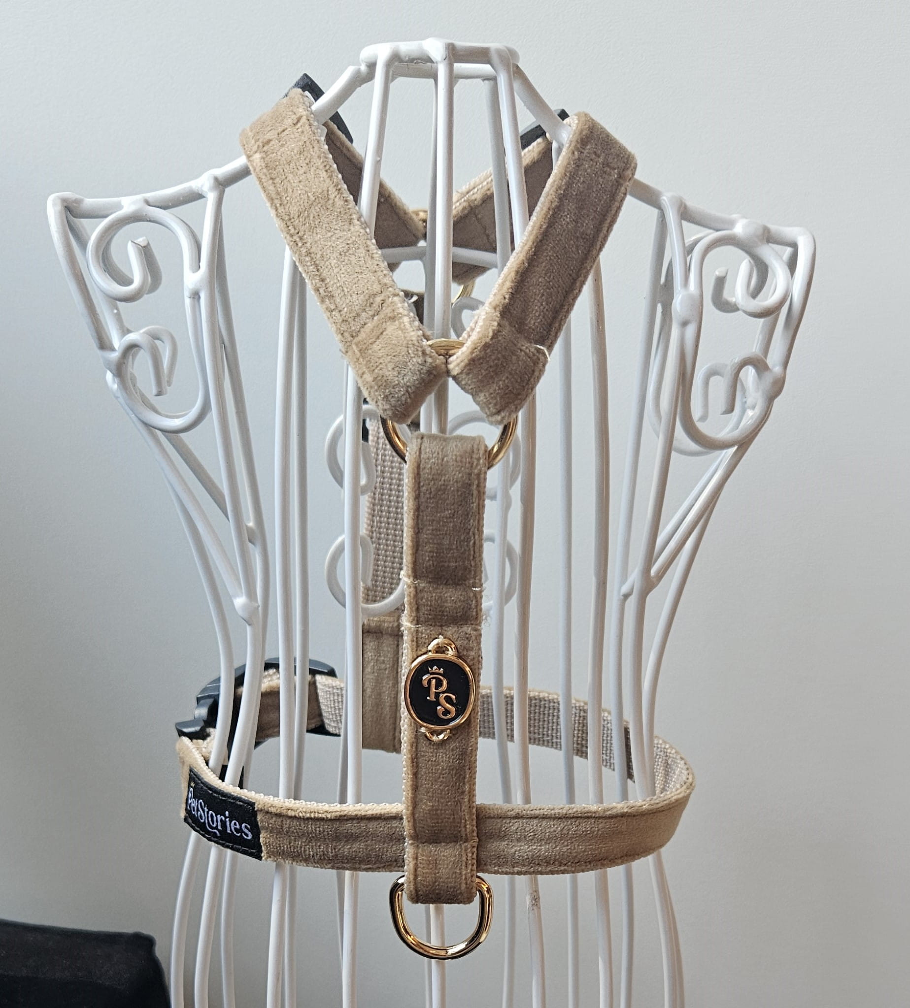 Elegancki design: połączenie weluru w beżowym kolorze z okuciami w złotym kolorze - minimalistyczna elegancja. Ekskluzywności dodaje elegancki emblemat z monogramem marki Petstories.