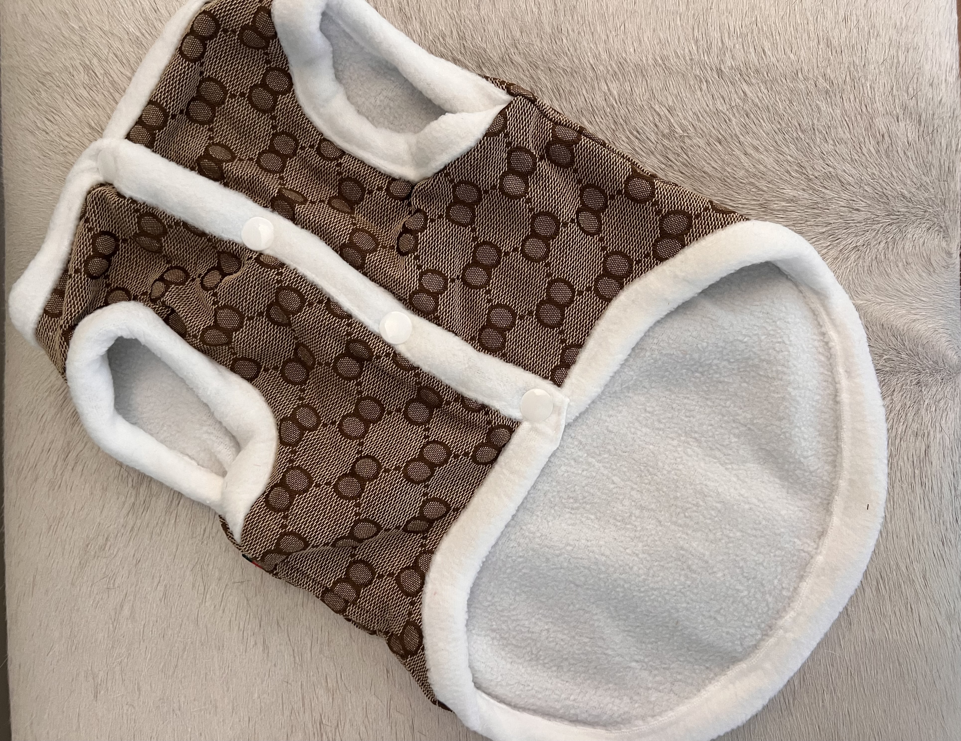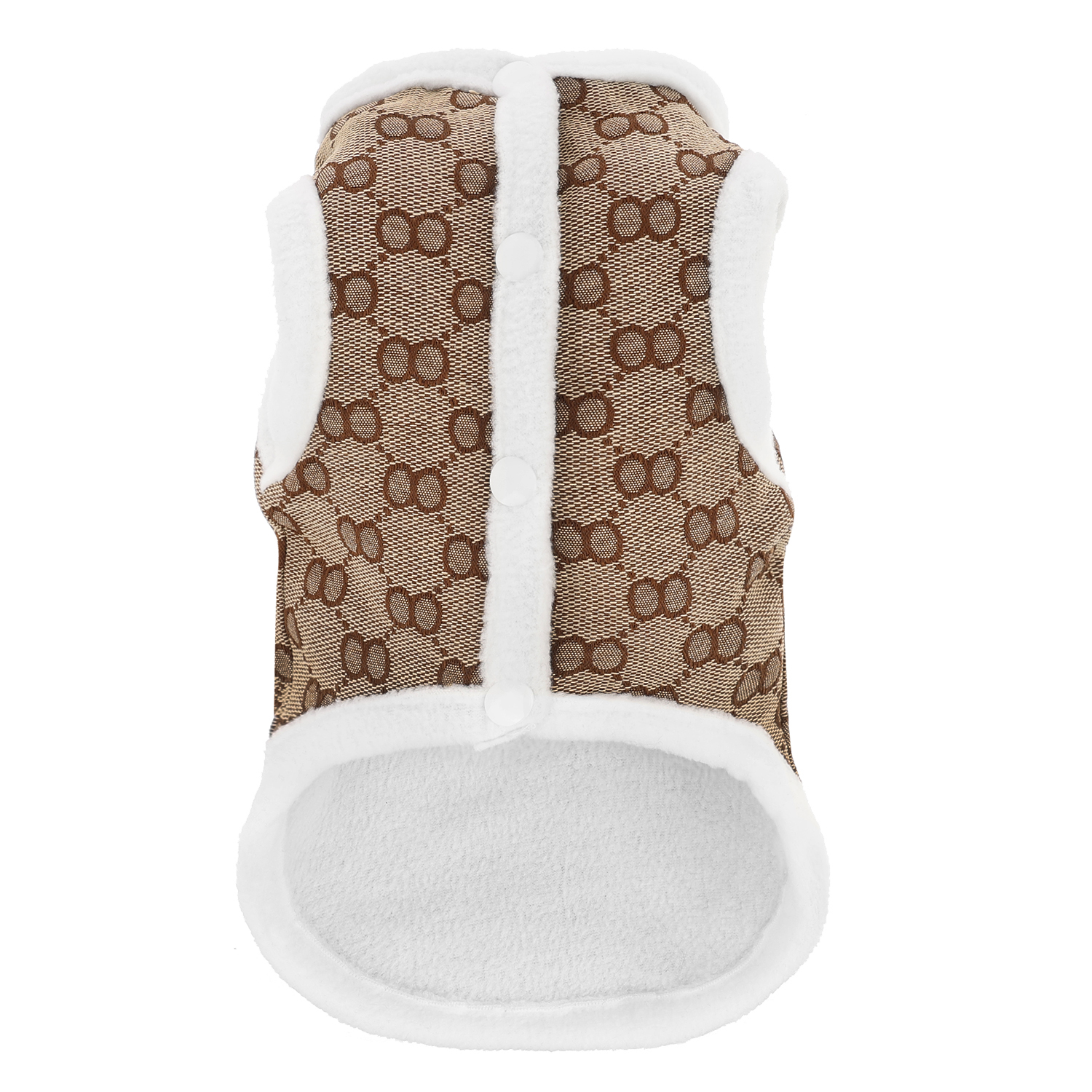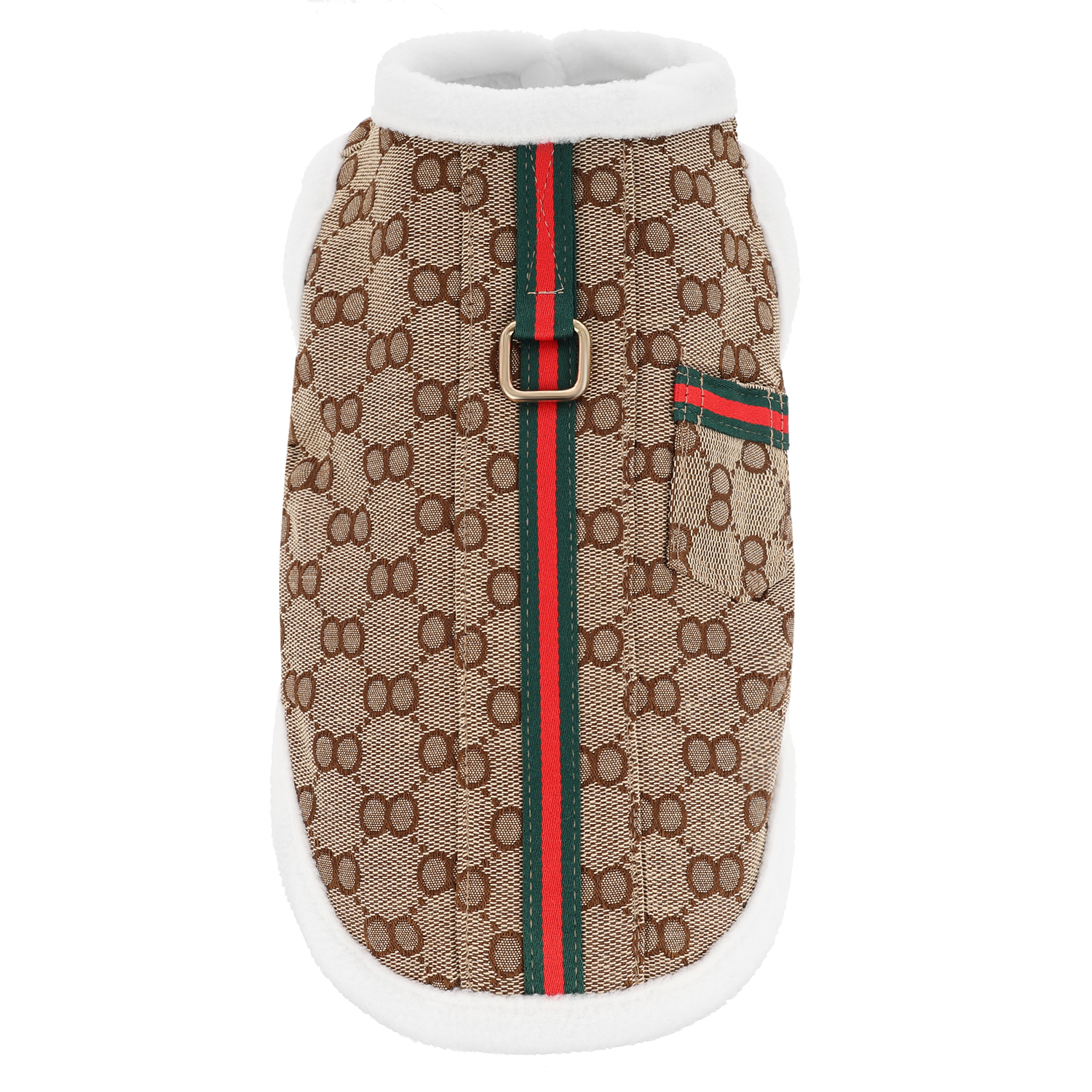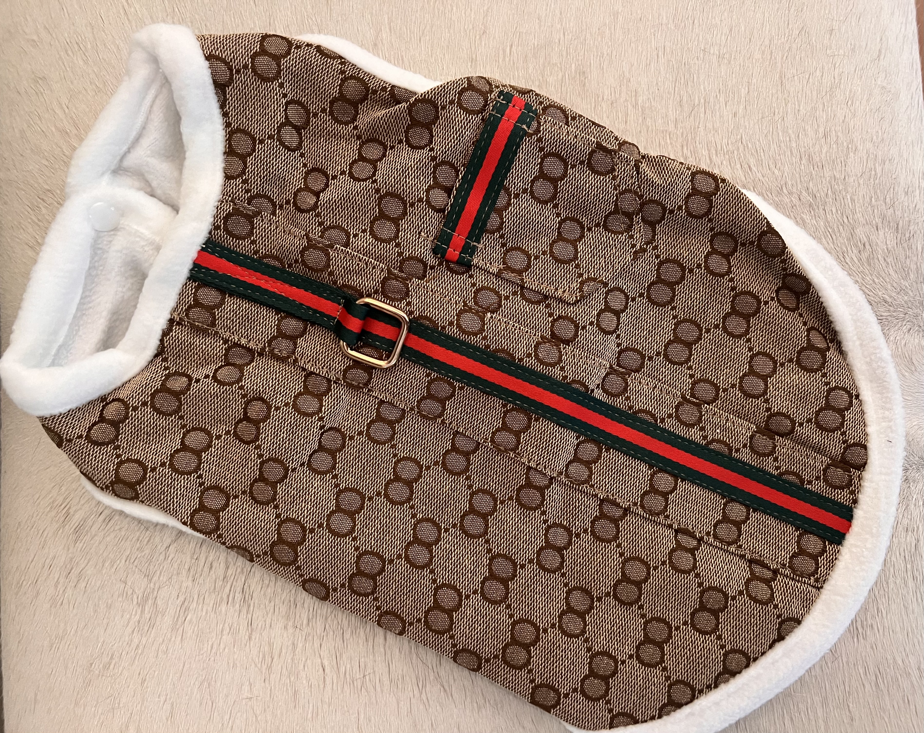 Stylowy design: eleganckie połączenie szykownego wzoru z polarkiem. Stylistyka inspirowana marką Gucci. Każdy piesek w tym ubranku będzie się wyróżniał na zimowych spacerach.