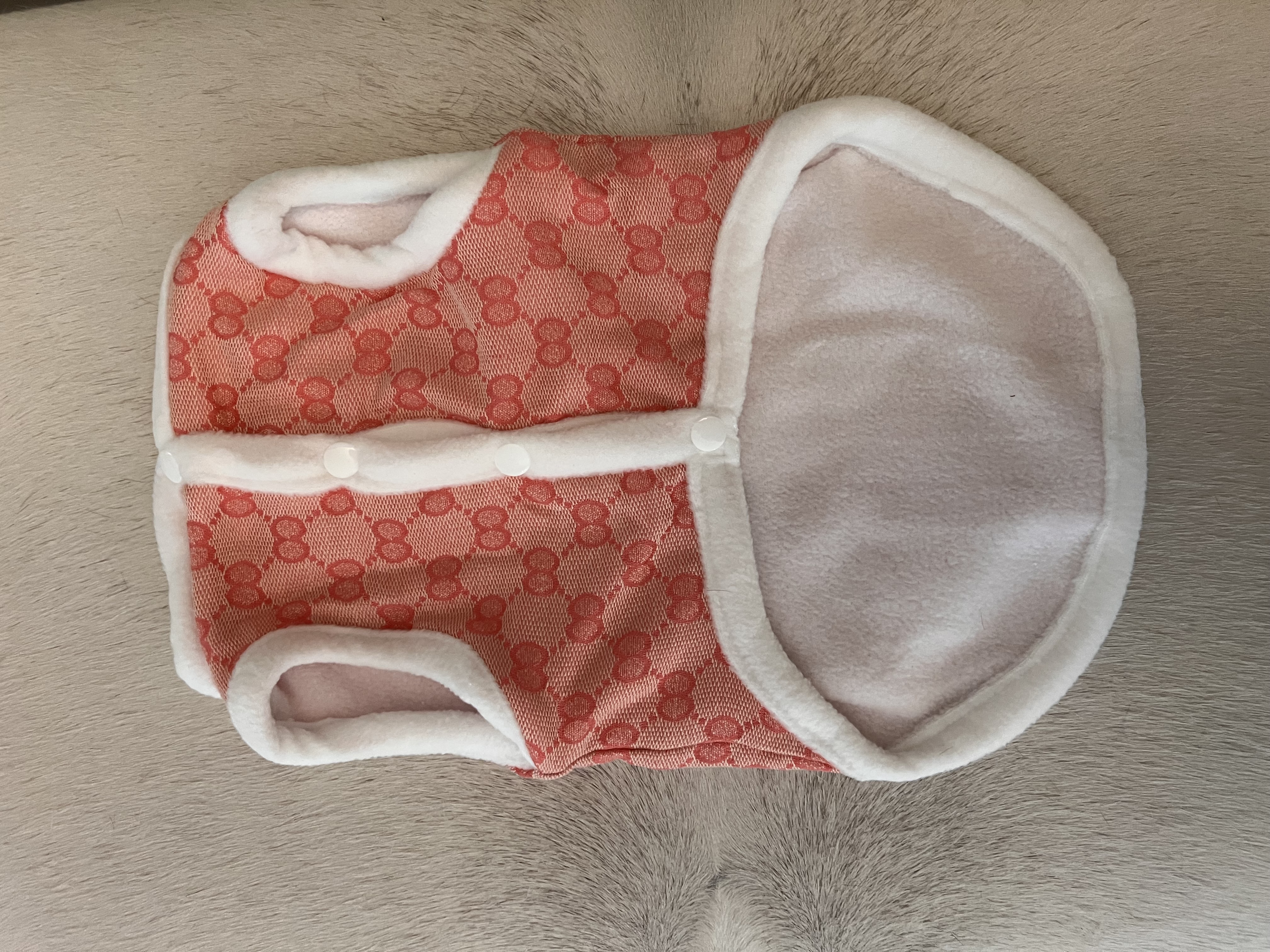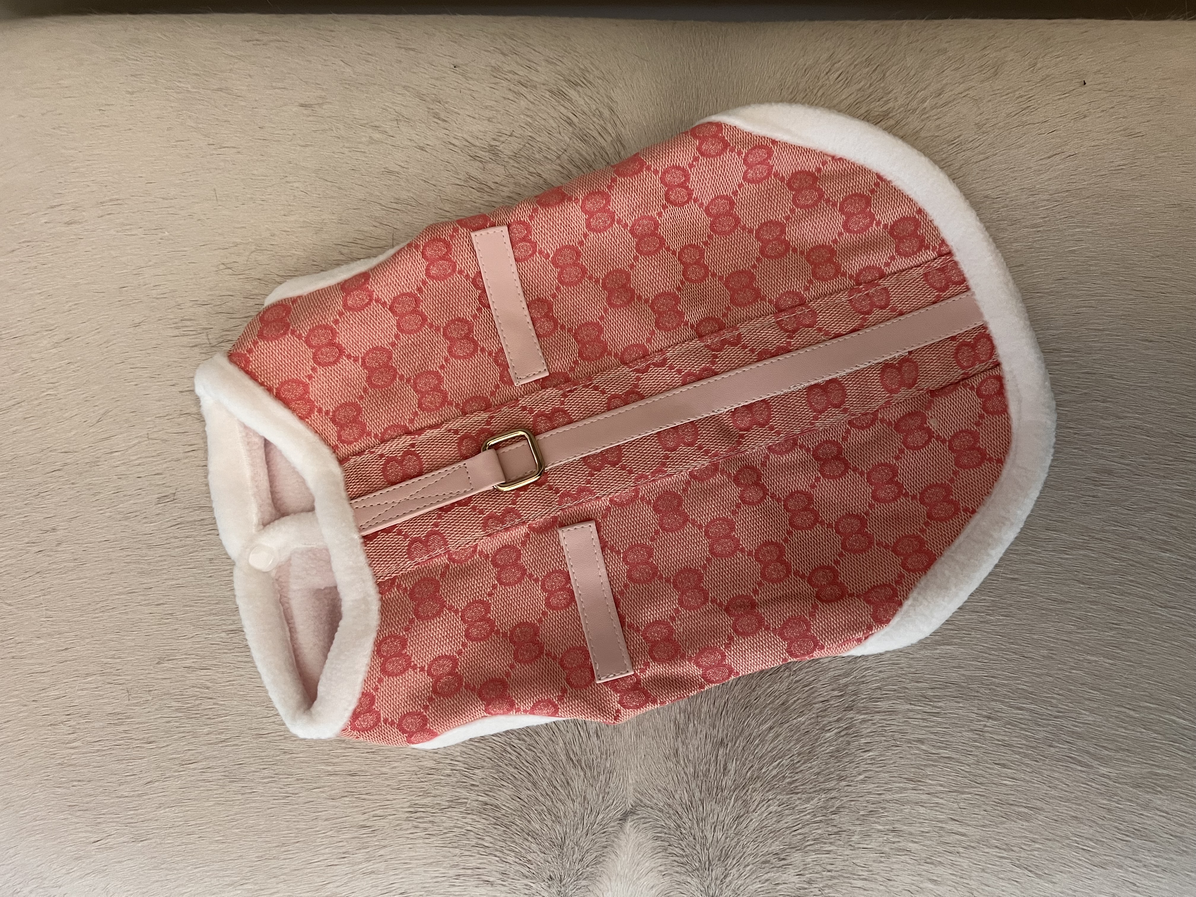 Stylowy design: eleganckie połączenie szykownego wzoru z polarkiem. Stylistyka inspirowana marką Gucci. Każdy piesek w tym ubranku będzie się wyróżniał na zimowych spacerach.