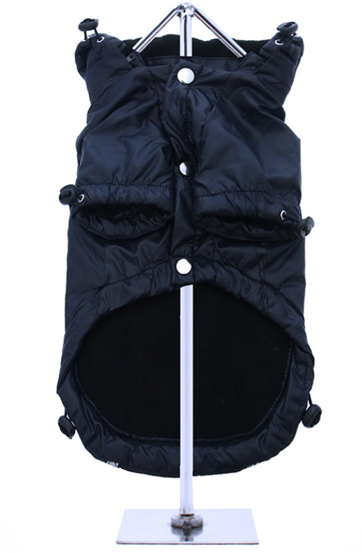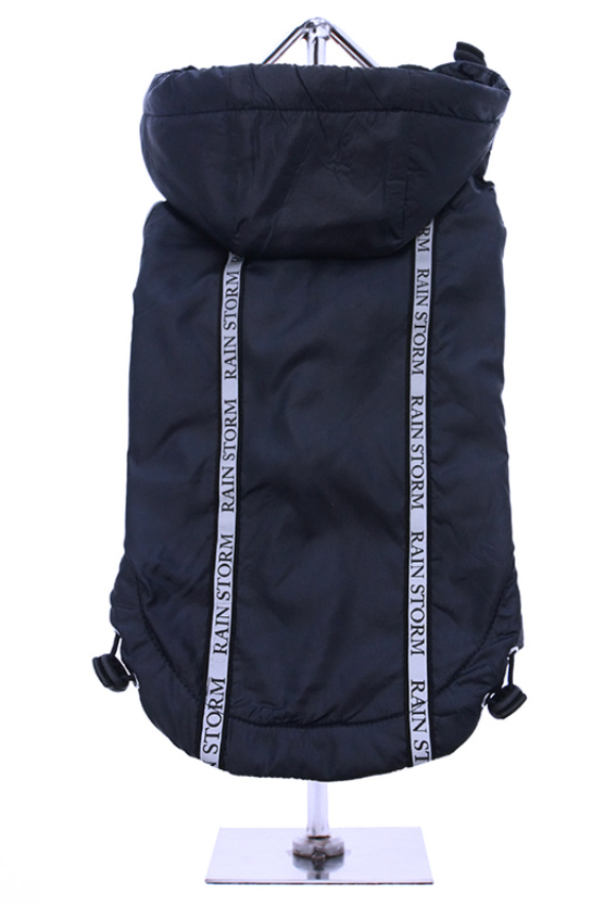Regulowany kaptur na ściągaczu dobrze przylega do głowy psa, chroniąc ją przed deszczem, a ściągacz u dołu kurtki pozwala dopasować ją do ciała, zapewniając ciepło i komfort. Ściągacze znajdują się również przy rękawach.