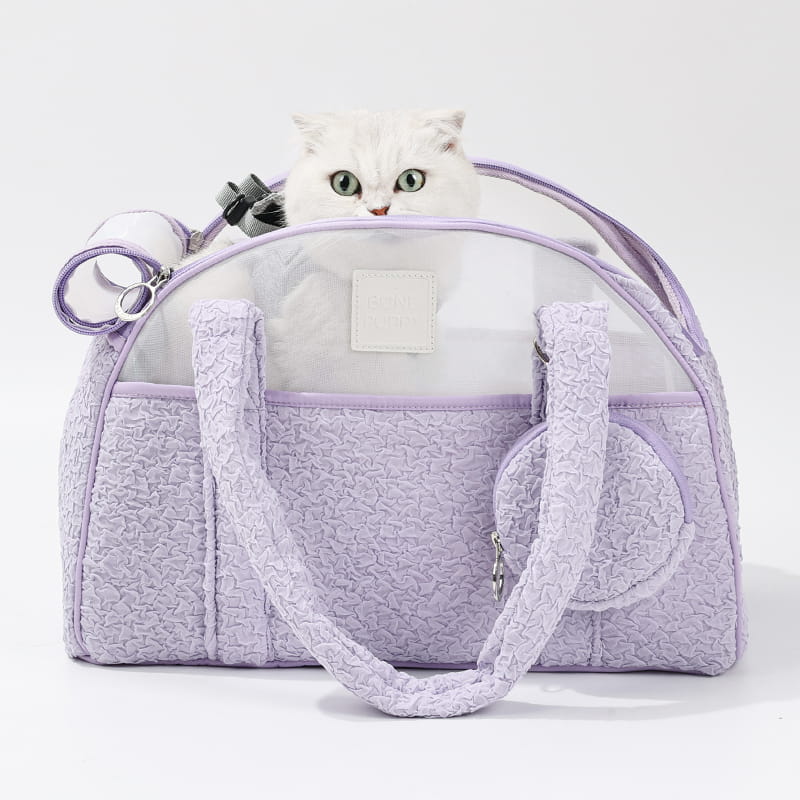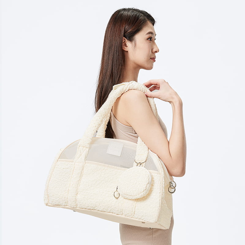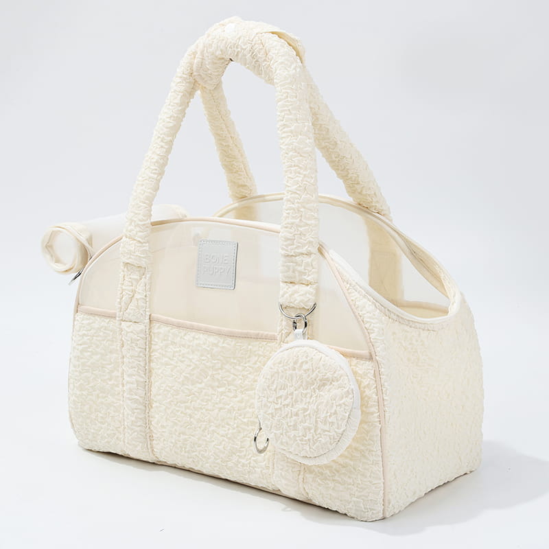 Wyjątkowa torba transportowa w delikatnym odcieniu beżu z elegancką fakturą, idealna dla właścicieli kotów i małych psów, którzy cenią połączenie luksusu z funkcjonalnością.