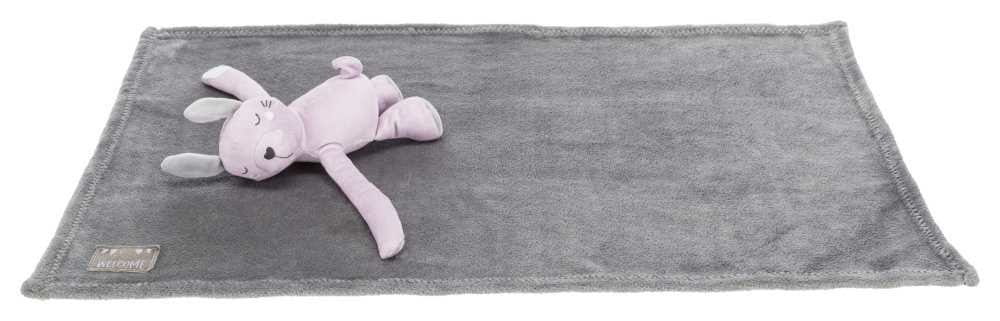 Kolorystyka: szary (kocyk), purpurowy (zabawka)